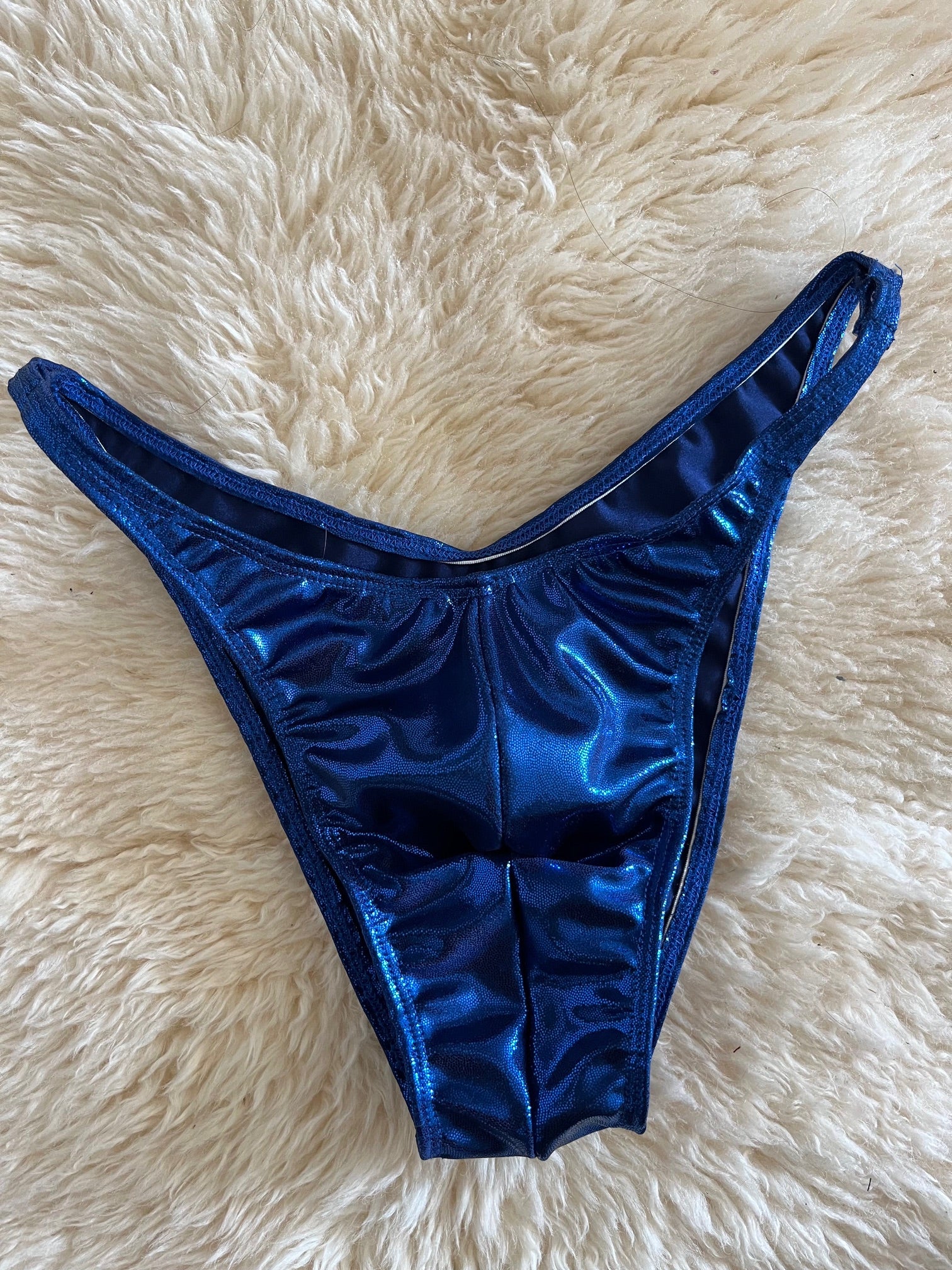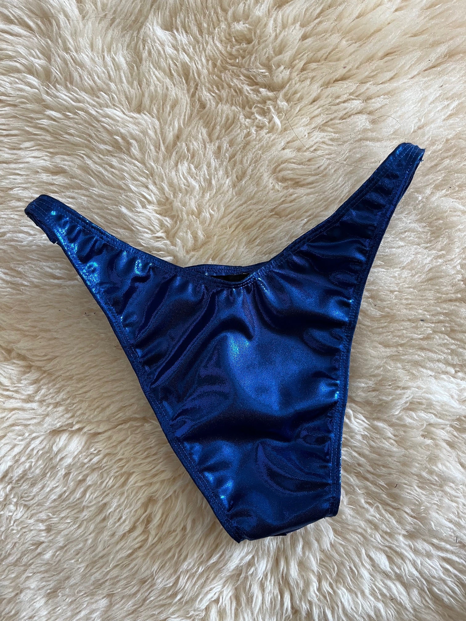Navy mystique fabric, 40% coverage on the back, 3/4" wide side straps.