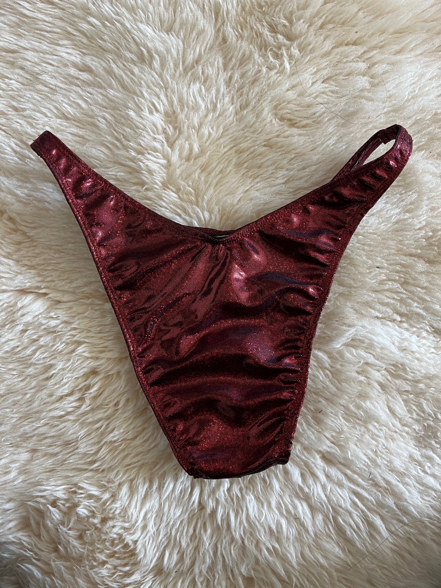 Deep Red Mystique fabric, 40% coverage on the back, 3/4" wide side straps.